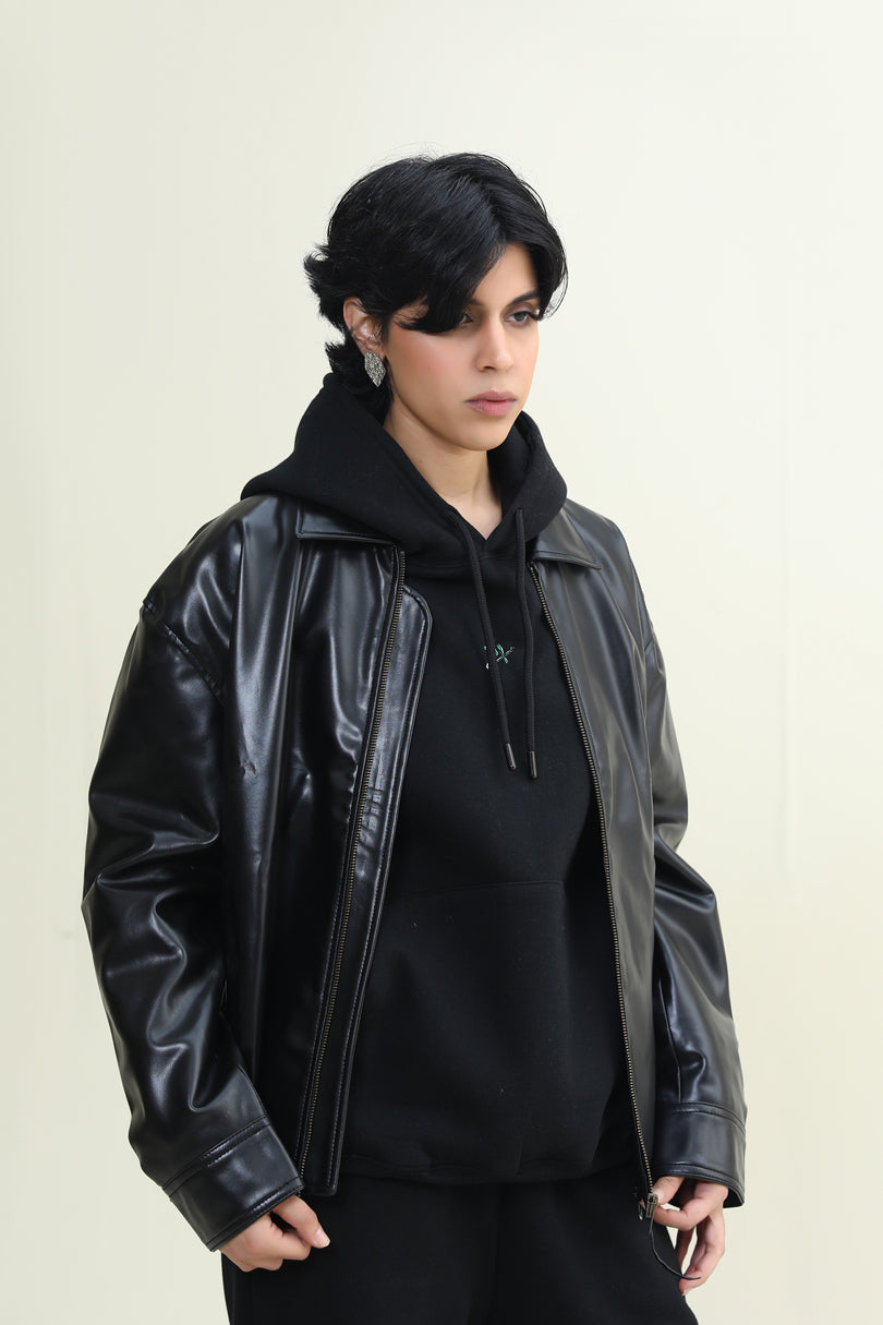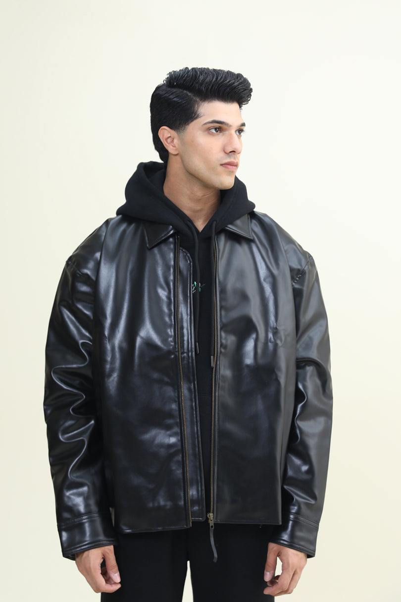 The Boxy Oversized Structured Faux Leather Jacket features a bold, oversized silhouette with a front zipper and side buttons for versatile styling. Crafted from high-quality faux leather, it combines durability with contemporary design, offering a relaxed, comfortable fit. A must-have piece for elevating both casual and refined outfits, available in black color.